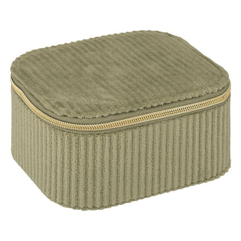 Sieradenkistje Bijou in het groen. Berg je sieraden stijlvol op met dit prachtige juwelenkistje in een groene kleur met handige rits! Dit compacte kistje met afmetingen van 9 x 5 x 11 cm is perfect om al je ringen, oorbellen, kettingen en armbanden overzichtelijk te bewaren. Dankzij de handige vakjesindeling houd je alles netjes gescheiden en binnen handbereik. Ideaal voor thuis op je nachtkastje of om mee te nemen op reis. Een perfecte mix van functionaliteit en elegantie! Een erg mooi opberg kistje die perfect gegeven kan worden als moederdag cadeau. Met dit sieradenkistje blijven je schatten niet alleen veilig, maar ook stijlvol opgeborgen. Tijd om te schitteren!